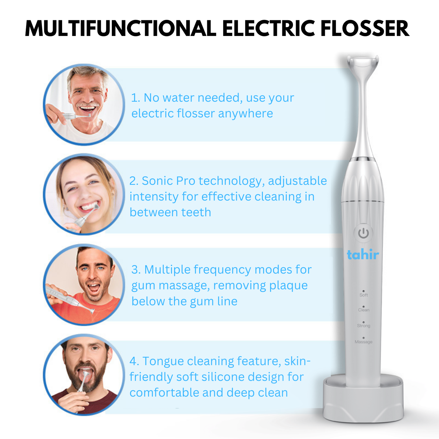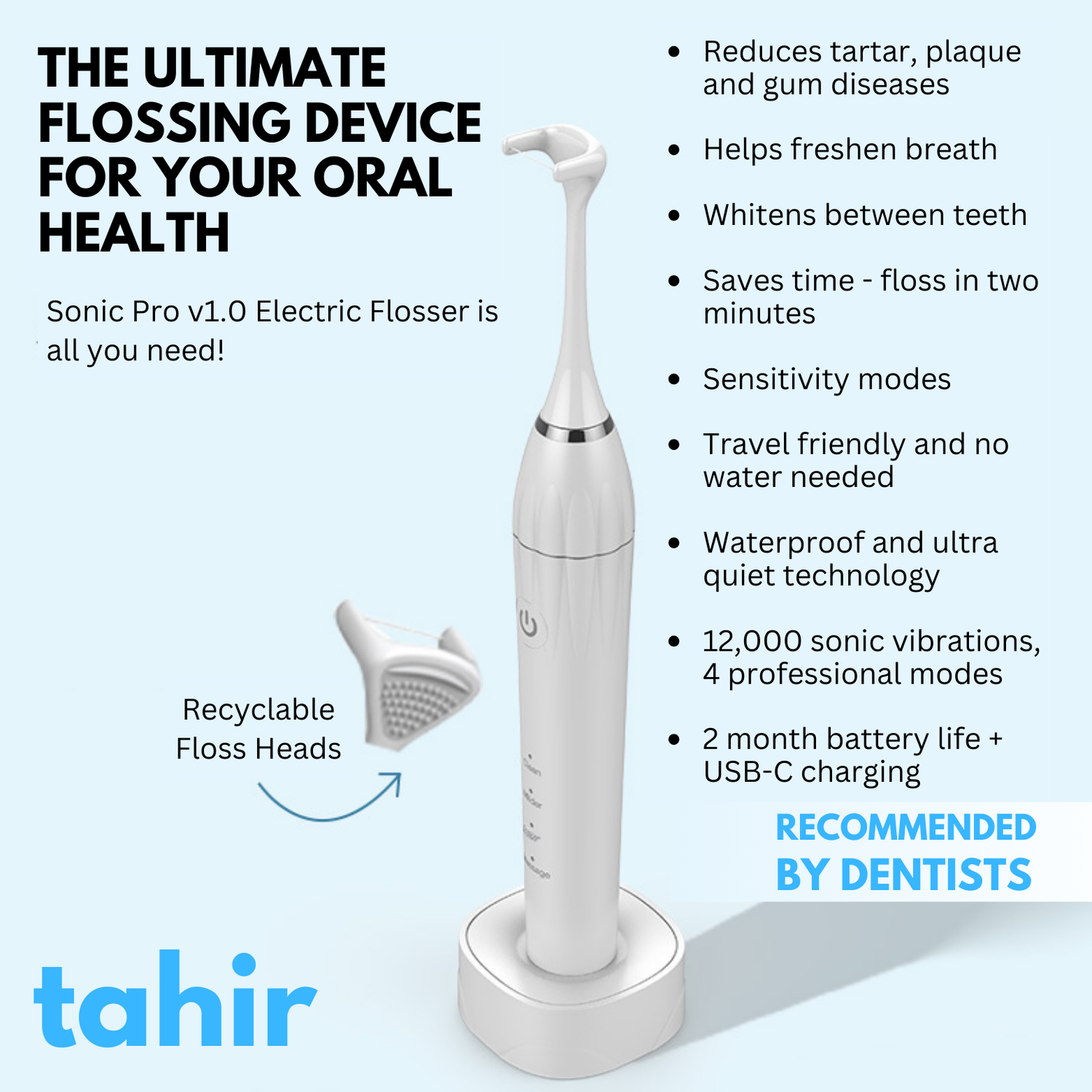 The Tahir Electric Flosser - Sonic Pro v1.0 offers faster, waste-reducing, and more efficient cleaning than traditional flossing tools, with sonic vibrations, a 2-month battery life, and the ability to clean below the gum line.
